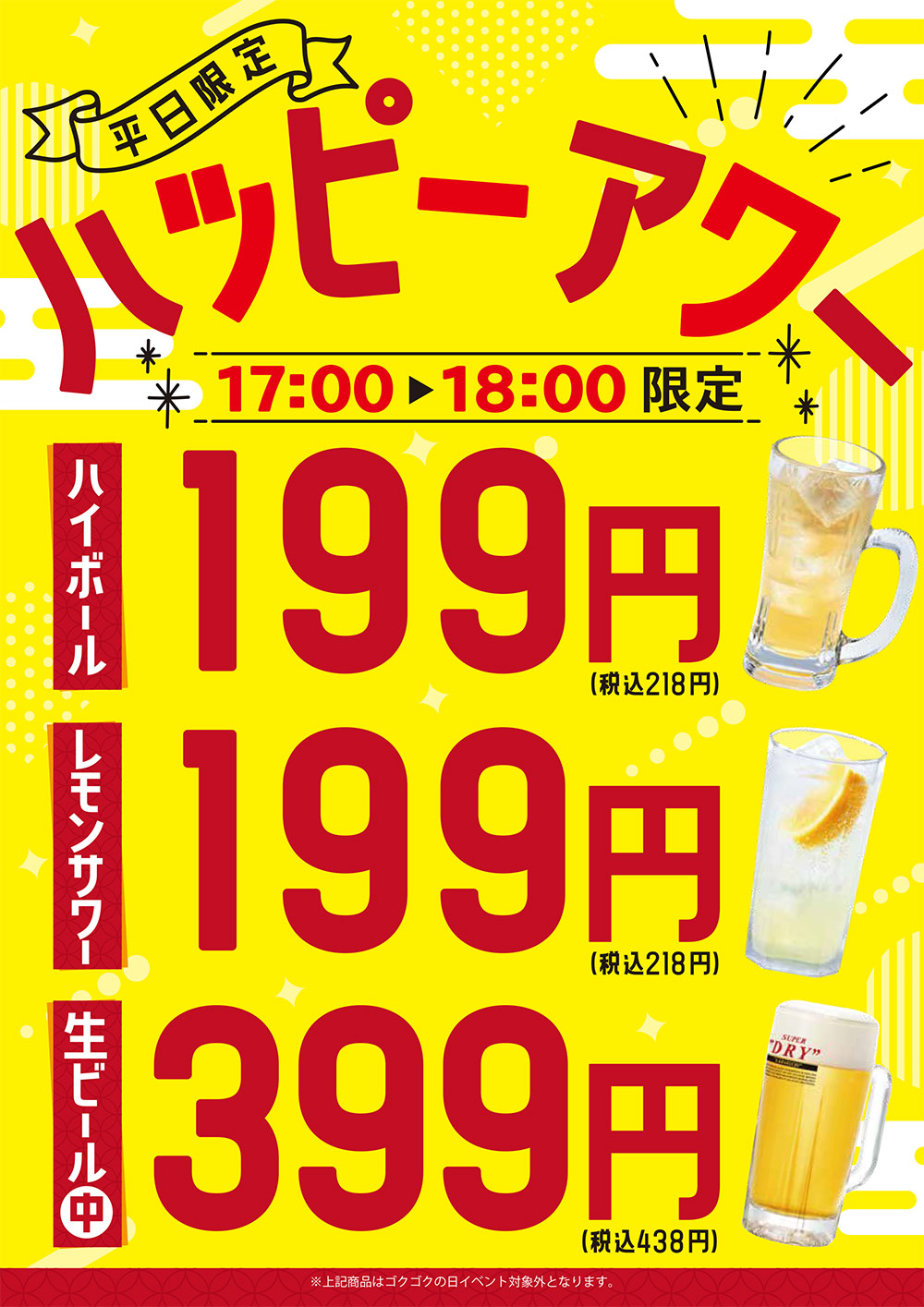 なんと…ハイボールとレモンサワーは199円(税込218円)!生ビール中も399円(税込438円)と大特価!!