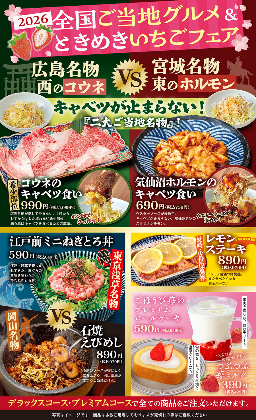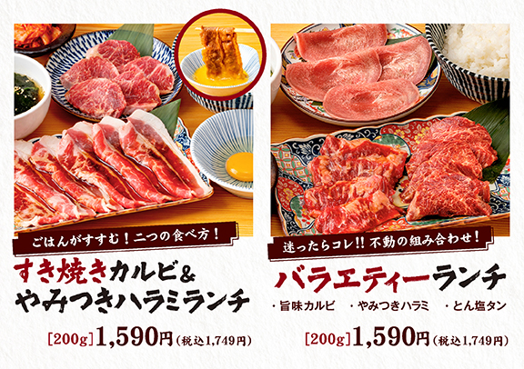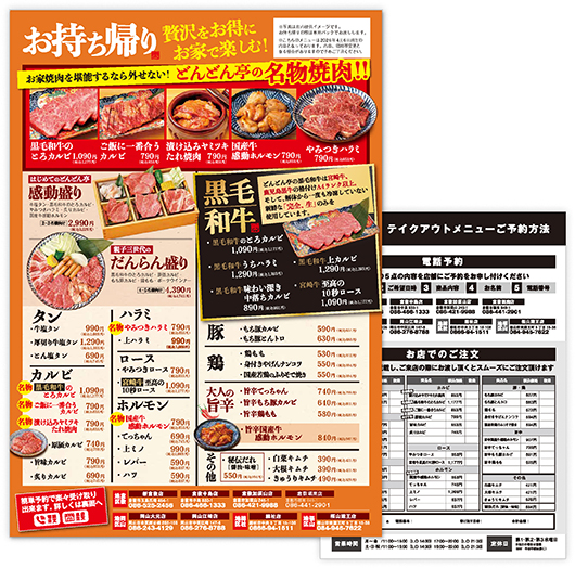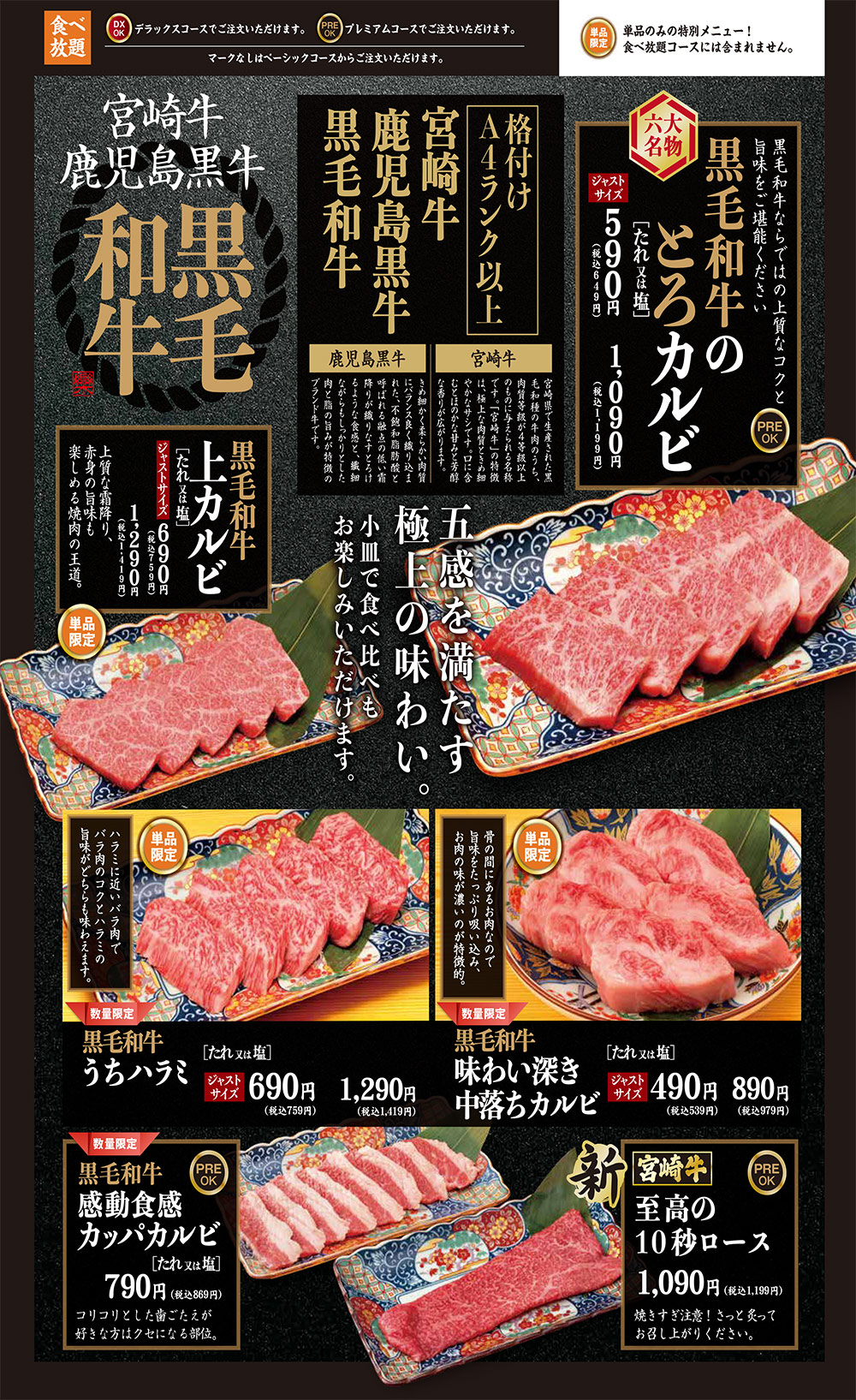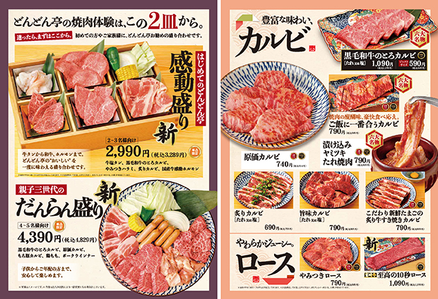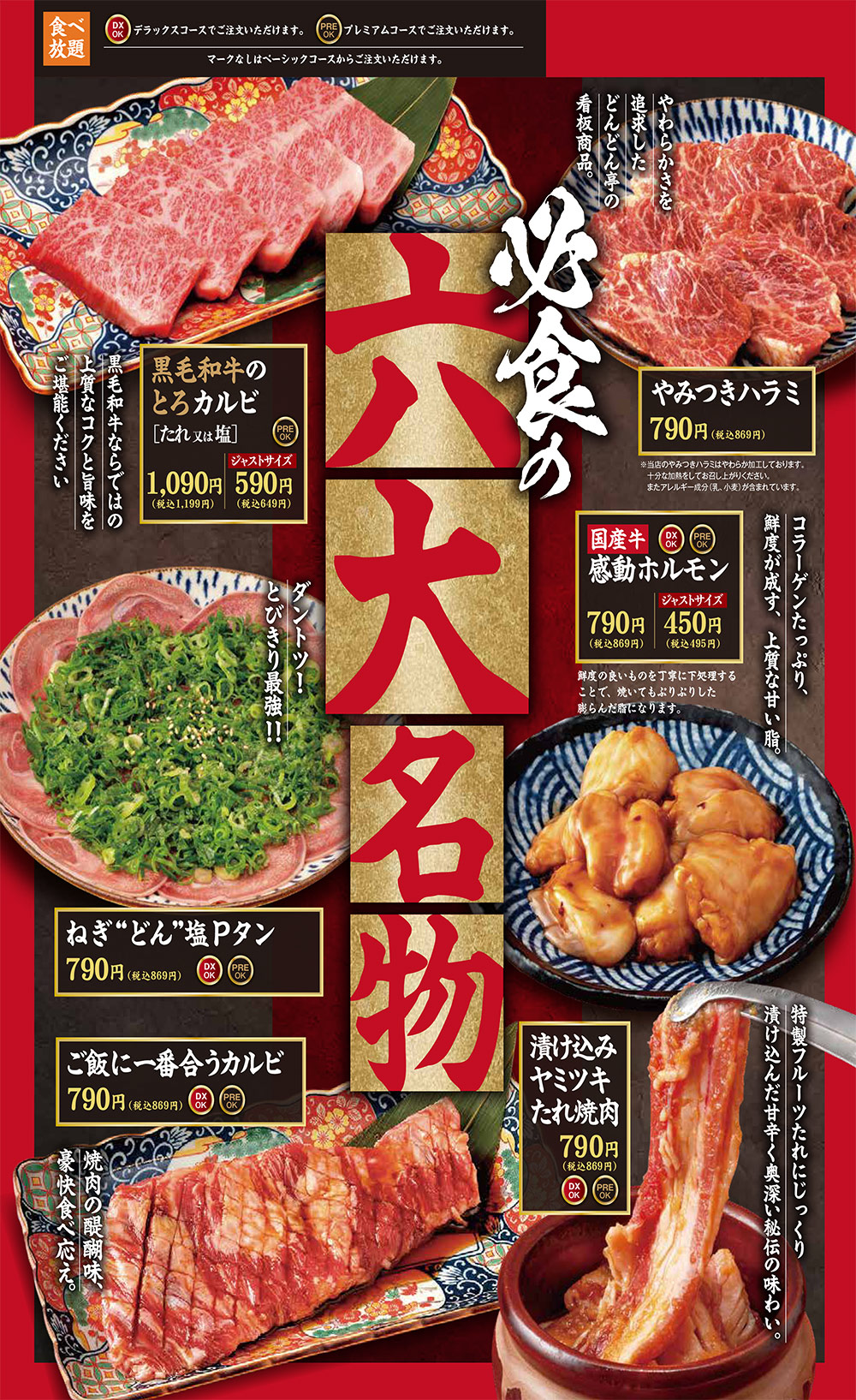 期間限定メニュー 秋のお月見焼肉フェア開催!焼肉どんどん亭で「おいしい秋」を見つけよう!! PDFで見る アレルギー情報はこちら 六大名物 名物「やみつきハラミ」をはじめ上質で美味しいお肉がお手頃価格で楽しめる!自慢のメニューをご紹介します。 詳しくはこちら 黒毛和牛 こだわりの黒毛和牛(宮崎牛鹿児島黒牛)が1品から楽しめます。一部食べ放題プレミアムコースでもご注文いただけます。 詳しくはこちら ランチ/定食 【平日限定】ランチメニューや、バリエーション豊富な定食メニューが楽しめます! 詳しくはこちら お子様メニュー 人気のプレートと定食をはじめ、お子様が喜ぶ豊富なメニューを取り揃えております! 詳しくはこちら 単品メニュー 一品から楽しめる単品メニューも充実。 おひとり様でもご家族様でも、いつでもお手頃価格で、 お好みの食べ比べや食べ合わせをお楽しみいただけます。 詳しくはこちら 食べ放題コース すべてのコースで座ったままご注文いただけます。 100分の焼肉食べ放題コースで、団欒の時間を心ゆくまでお楽しみください。 スタンダードをお気軽に。 ベーシックコース 3,980円(税込4,378円) 3歳以下無料小学生半額幼児割・シニア割 詳しくはこちら お肉も逸品も充実! デラックスコース 4,480円(税込4,928円) 3歳以下無料小学生半額幼児割・シニア割 詳しくはこちら ハレの日のちょっと贅沢。 プレミアムコース 5,980円(税込6,578円) 3歳以下無料小学生半額幼児割・シニア割 詳しくはこちら テイクアウト お家でも焼肉どんどん亭自慢のお肉をご賞味いただけるようお持ち帰りメニューもご用意。お電話またはご来店にて承っております。 詳しくはこちら メニュートップ 六大名物 食べ放題コース 黒毛和牛 ランチ/定食 お子様メニュー 単品・ドリンクメニュー テイクアウト
