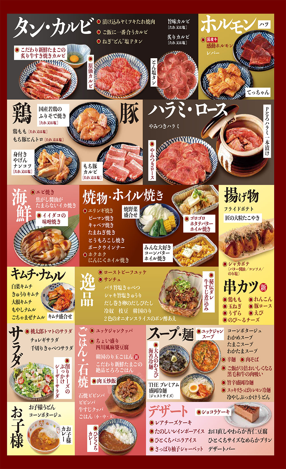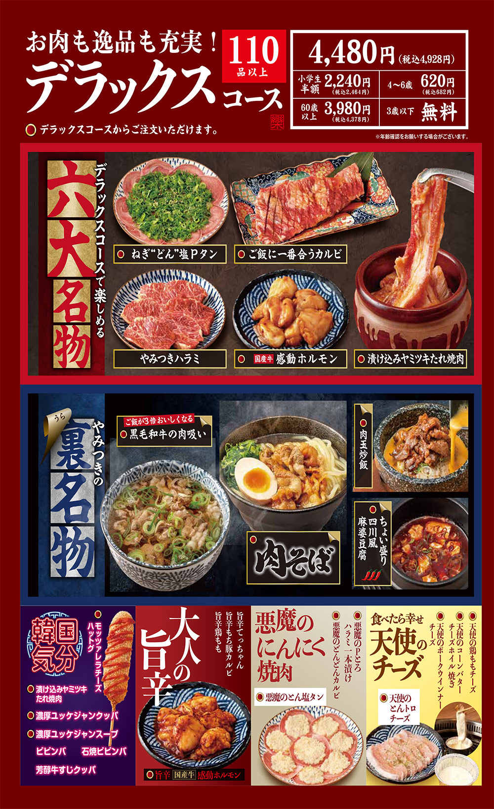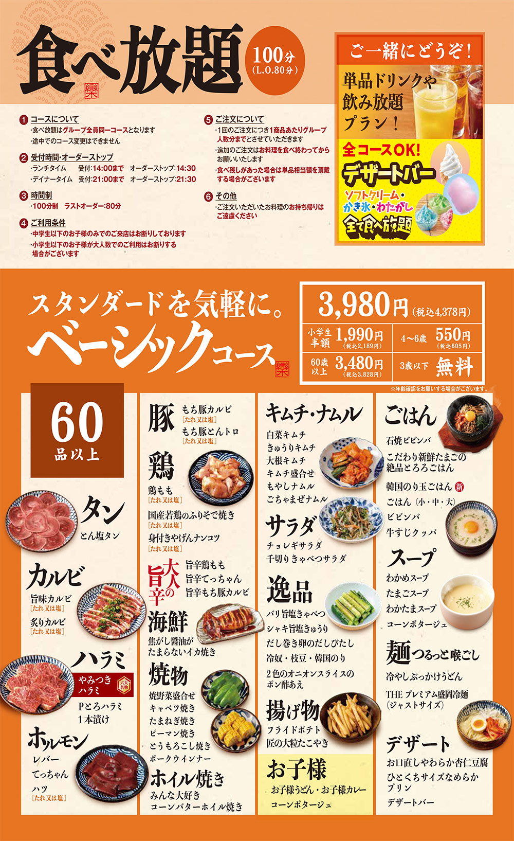 ベーシックコース 3,980円(税込4,378円) デラックスコース 4,480円(税込4,928円) プレミアムコース 5,980円(税込6,578円) PDFで見る アレルギー情報はこちら メニュートップ 六大名物 食べ放題コース 黒毛和牛 ランチ/定食 お子様メニュー 単品・ドリンクメニュー テイクアウト