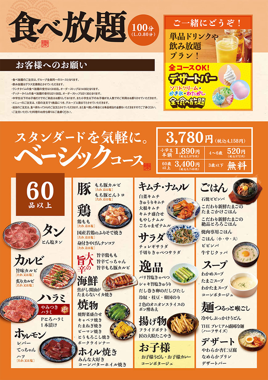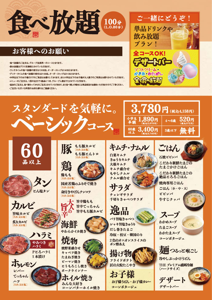 〈食べ放題〉ベーシックコース 〈食べ放題〉デラックスコース 〈食べ放題〉プレミアムコース 期間限定 グランドメニュー お子様メニュー ランチ 定食 ドリンク テイクアウト 〈食べ放題〉ベーシックコース スタンダードを気軽に。 お席に座ったまま注文できる、100分の焼肉食べ放題! 美味しいお肉を心ゆくまで楽しめます。 ※一部店舗ではメニューの内容が異なります。また、掲載後に商品および価格が変更になる場合がございます。予めご了承ください。