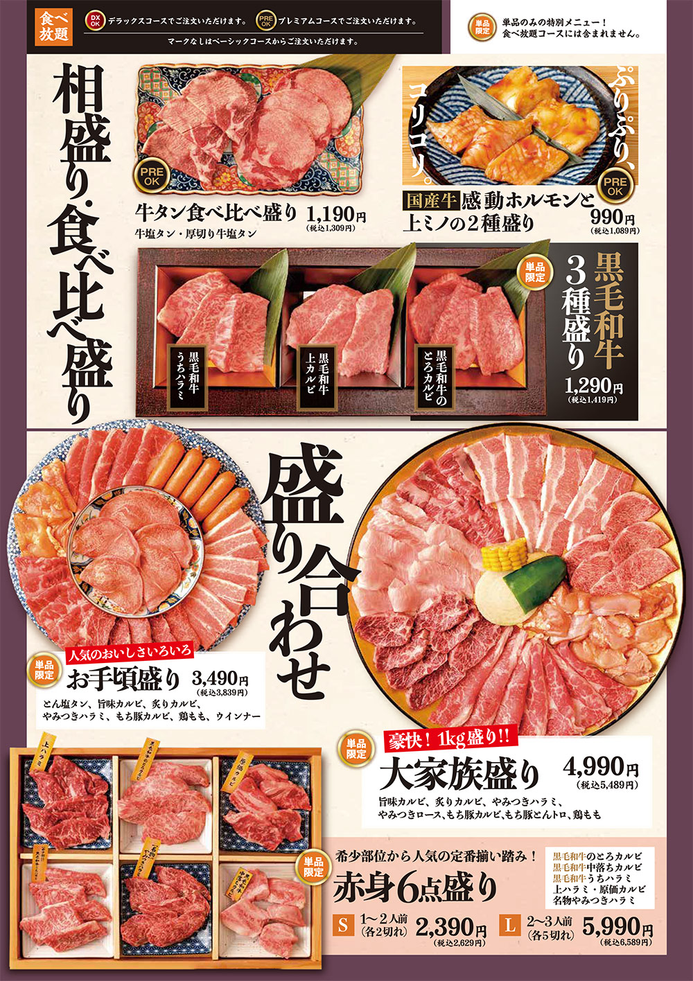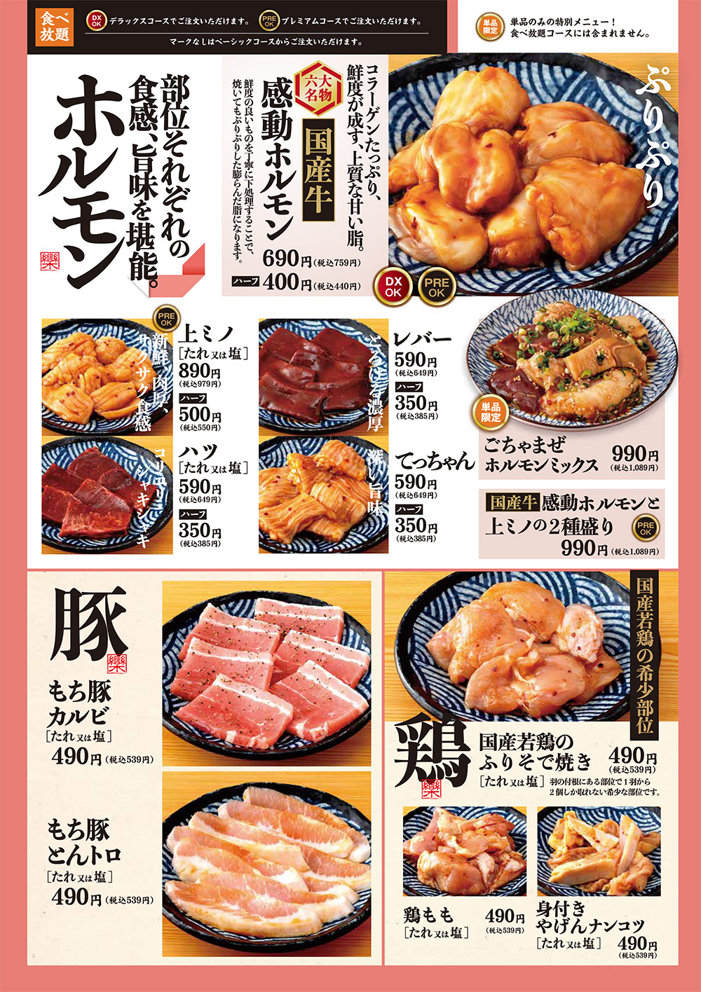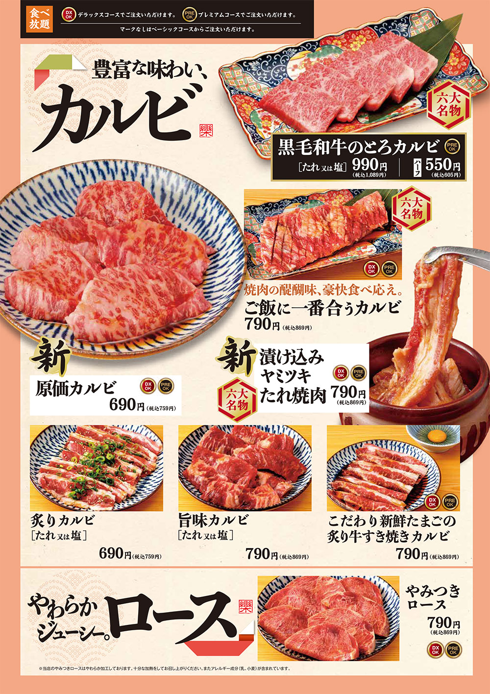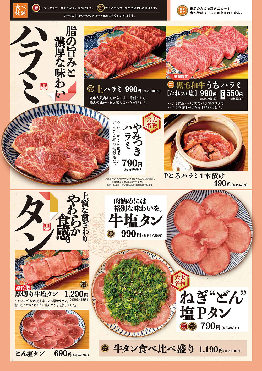 〈食べ放題〉ベーシックコース 〈食べ放題〉デラックスコース 〈食べ放題〉プレミアムコース 期間限定 グランドメニュー お子様メニュー ランチ 定食 ドリンク テイクアウト グランドメニュー 名物「やみつきハラミ」をはじめ 上質で美味しいお肉がお手頃価格で楽しめる! 自慢のメニューをご紹介します。 ※一部店舗ではメニューの内容が異なります。また、掲載後に商品および価格が変更になる場合がございます。予めご了承ください。