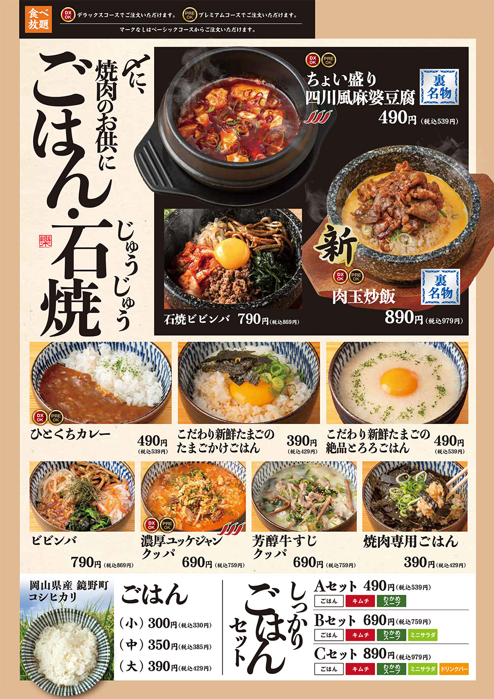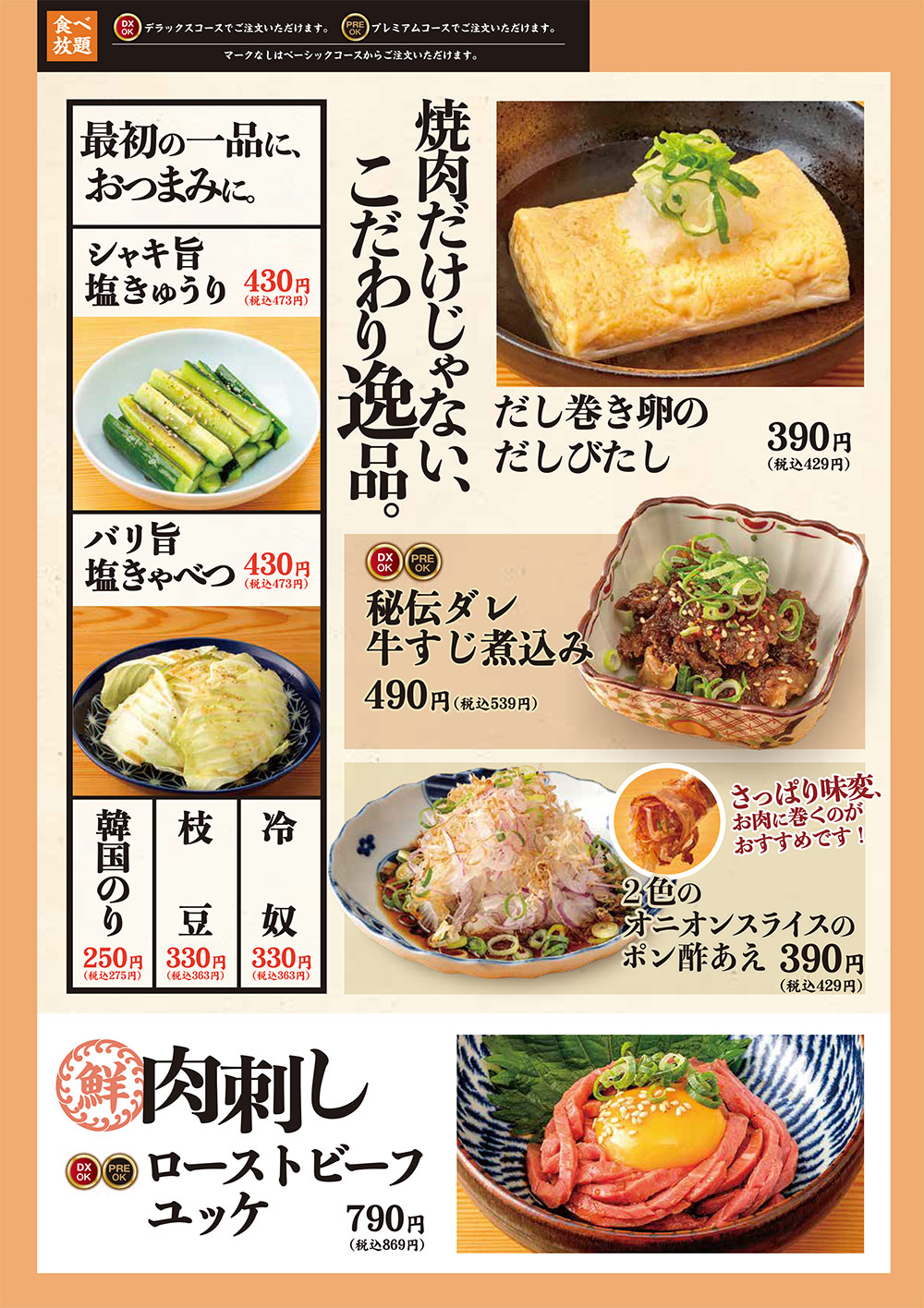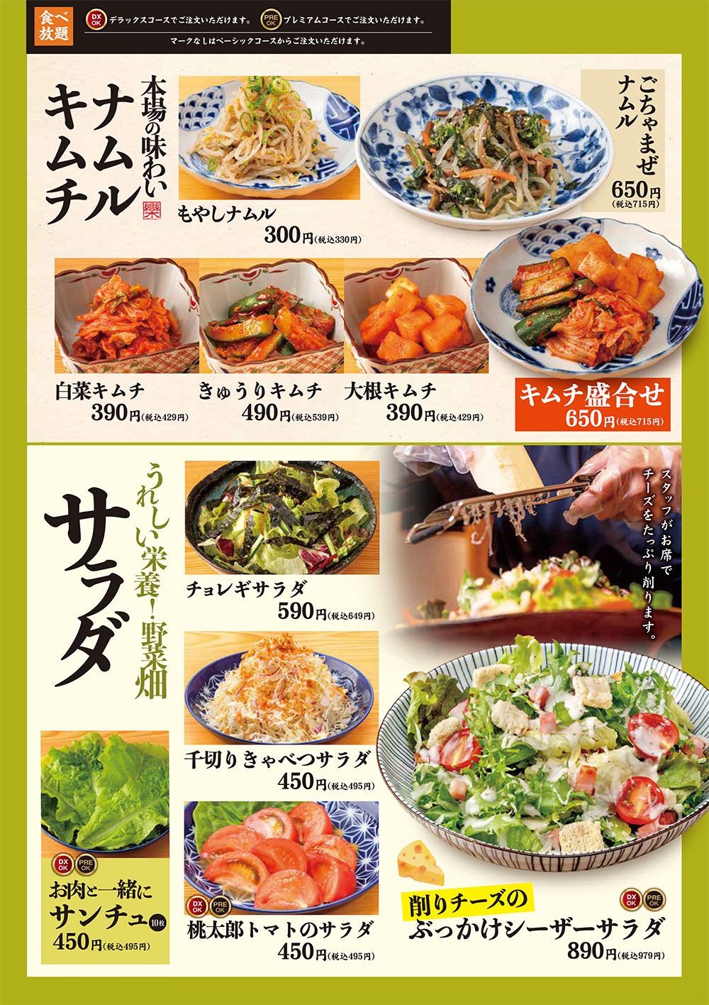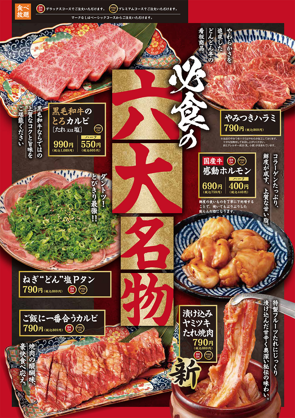 〈食べ放題〉ベーシックコース 〈食べ放題〉デラックスコース 〈食べ放題〉プレミアムコース 期間限定 グランドメニュー お子様メニュー ランチ 定食 ドリンク テイクアウト グランドメニュー 名物「やみつきハラミ」をはじめ 上質で美味しいお肉がお手頃価格で楽しめる! 自慢のメニューをご紹介します。 ※一部店舗ではメニューの内容が異なります。また、掲載後に商品および価格が変更になる場合がございます。予めご了承ください。