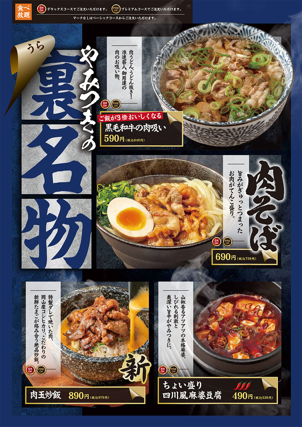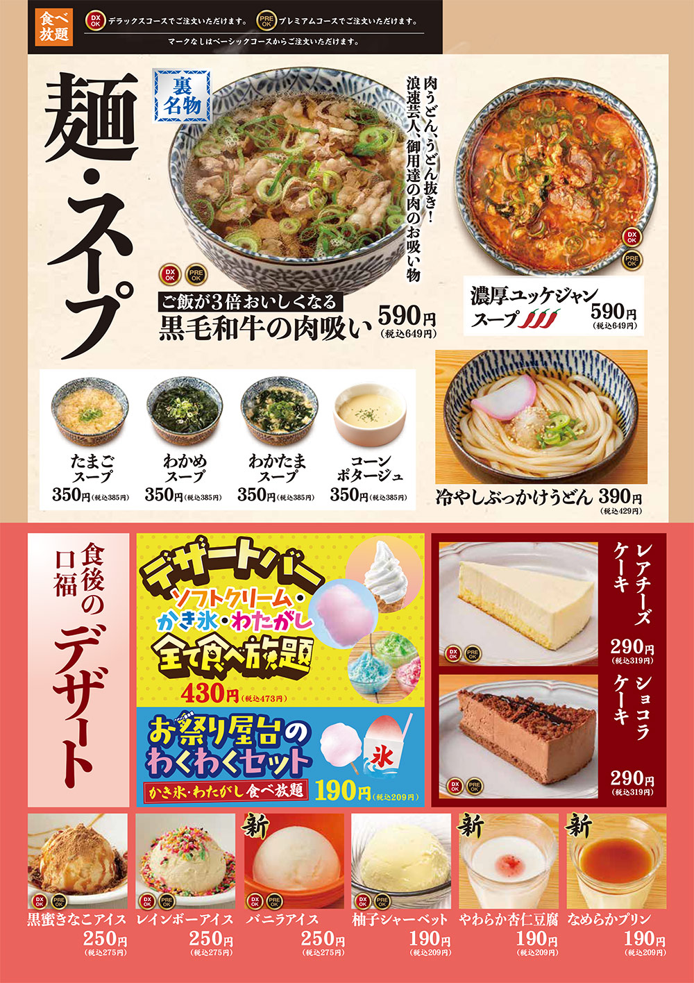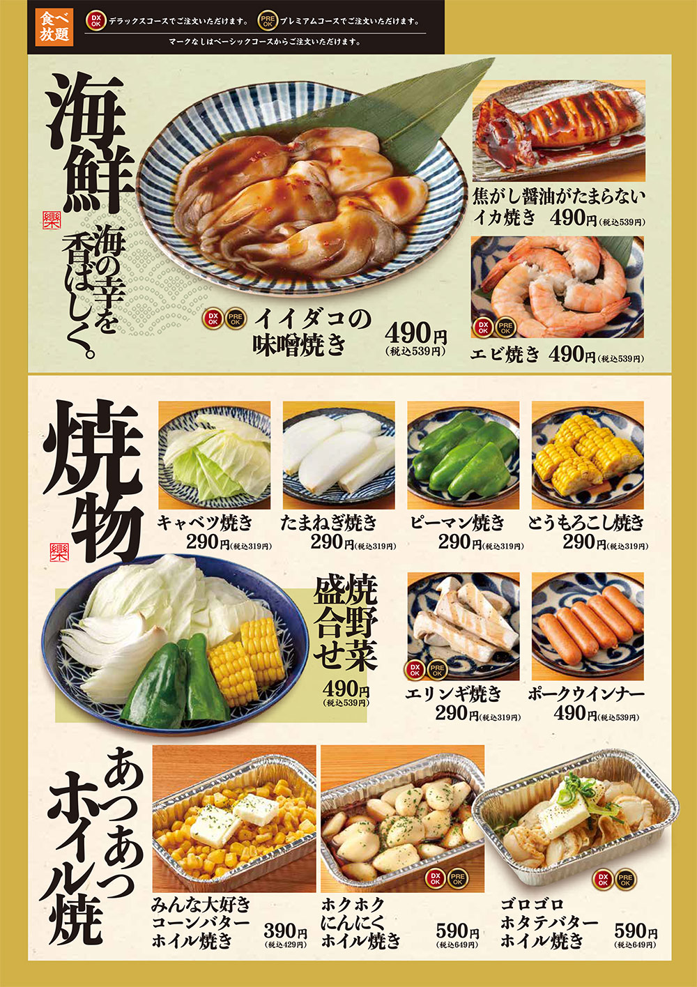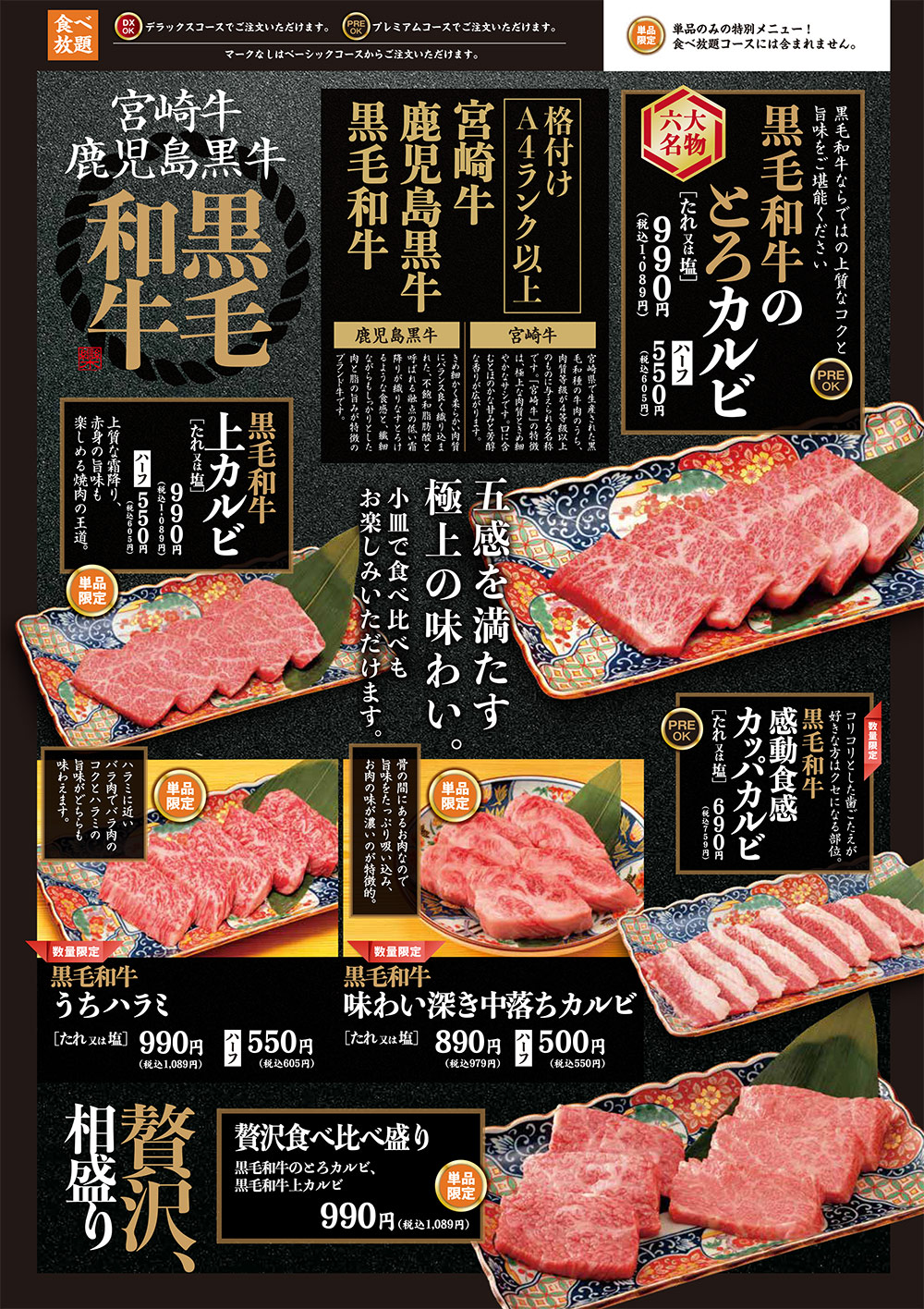 〈食べ放題〉ベーシックコース 〈食べ放題〉デラックスコース 〈食べ放題〉プレミアムコース 期間限定 グランドメニュー お子様メニュー ランチ 定食 ドリンク テイクアウト グランドメニュー 名物「やみつきハラミ」をはじめ 上質で美味しいお肉がお手頃価格で楽しめる! 自慢のメニューをご紹介します。 ※一部店舗ではメニューの内容が異なります。また、掲載後に商品および価格が変更になる場合がございます。予めご了承ください。