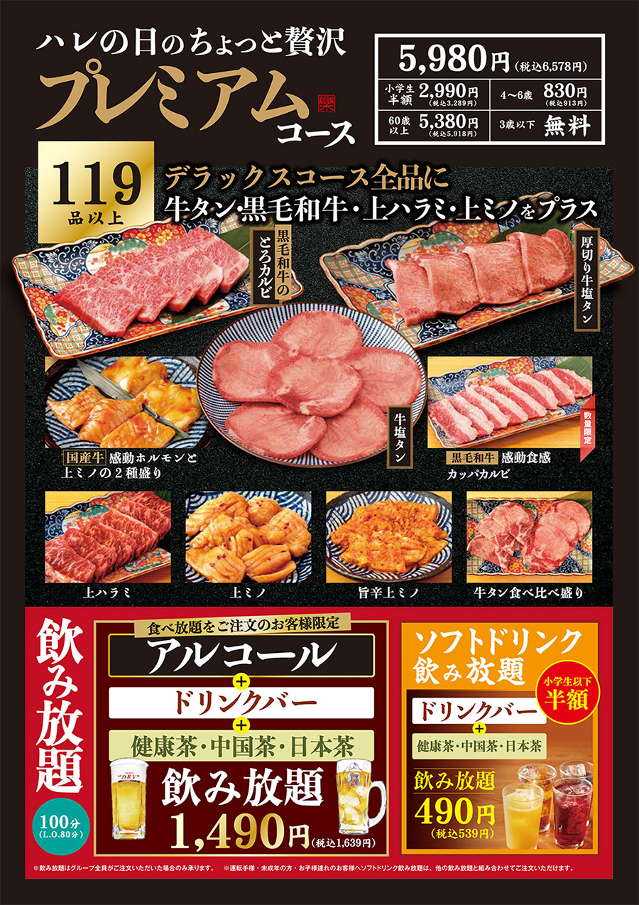 〈食べ放題〉ベーシックコース 〈食べ放題〉デラックスコース 〈食べ放題〉プレミアムコース 期間限定 グランドメニュー お子様メニュー ランチ 定食 ドリンク テイクアウト 〈食べ放題〉プレミアムコース ハレの日のちょっと贅沢。 お席に座ったまま注文できる、100分の焼肉食べ放題! 美味しいお肉を心ゆくまで楽しめます。 ※一部店舗ではメニューの内容が異なります。また、掲載後に商品および価格が変更になる場合がございます。予めご了承ください。