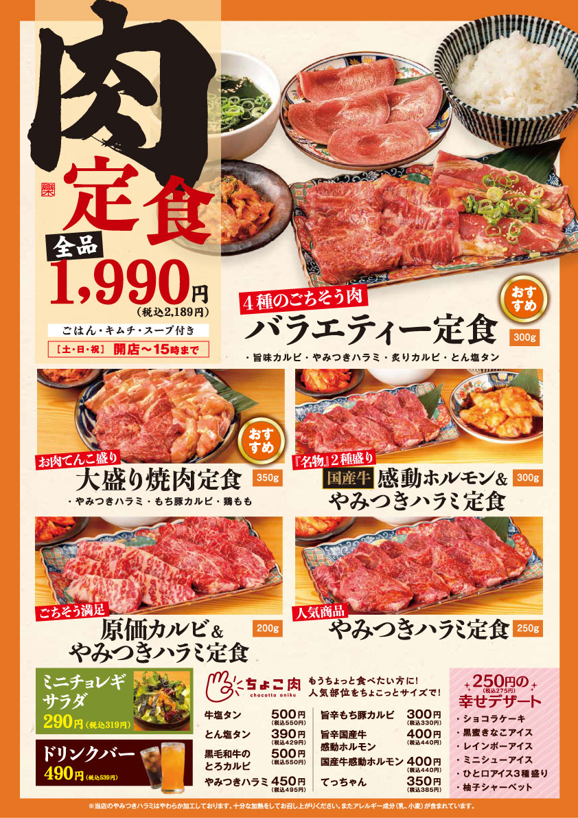 〈食べ放題〉ベーシックコース 〈食べ放題〉デラックスコース 〈食べ放題〉プレミアムコース 期間限定 グランドメニュー お子様メニュー ランチ 定食 ドリンク テイクアウト 定食メニュー 「満腹×満足」 どんどん亭イチ押しのお肉をメインに据えた お値打ち価格の定食メニュー。 ※一部店舗ではメニューの内容が異なります。また、掲載後に商品および価格が変更になる場合がございます。予めご了承ください。
