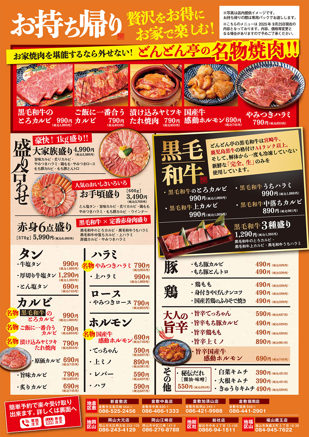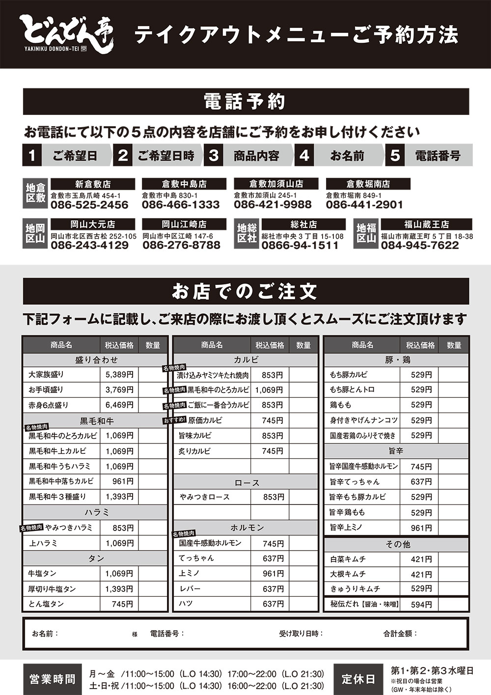 〈食べ放題〉ベーシックコース 〈食べ放題〉デラックスコース 〈食べ放題〉プレミアムコース 期間限定 グランドメニュー お子様メニュー ランチ 定食 ドリンク テイクアウト テイクアウトメニュー お家でもどんどん亭自慢のお肉をご賞味いただけるよう お持ち帰りメニューもご用意。 お電話またはご来店にて承っております。 ※一部店舗ではメニューの内容が異なります。また、掲載後に商品および価格が変更になる場合がございます。予めご了承ください。
